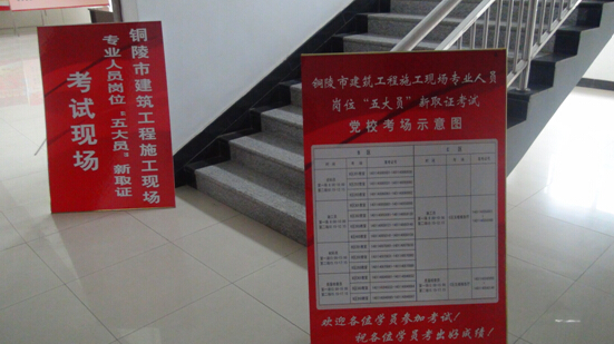 2014年6月21日,銅陵市建筑工程施工現(xiàn)場專業(yè)人員(質(zhì)檢員、資料員、施工員、材料員)考試在銅陵市中共市委黨校舉行,共有476學員參加考試,施工員159人,質(zhì)檢員146人,材料員89人,資料員82人。安徽省住建廳建設(shè)干部學校、市住建委、建筑工程管理局、建設(shè)行業(yè)職業(yè)培訓學校相關(guān)領(lǐng)導參加巡考.